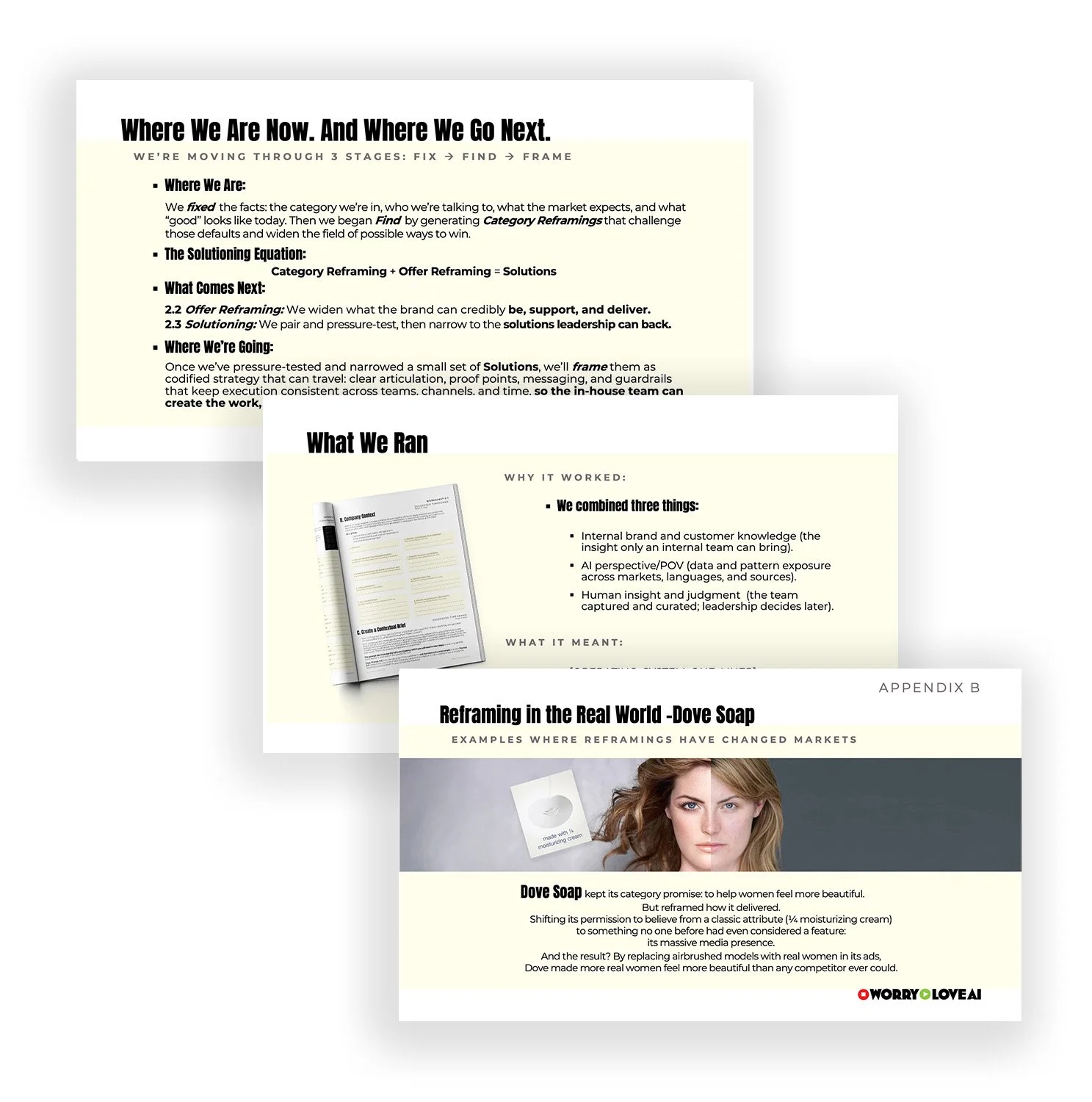 It shapes emerging directions into strategic platforms, sharper positioning, clearer briefs, and stronger decks, producing outputs that don’t just point to a stronger direction, but help build the internal consensus needed to make it real.